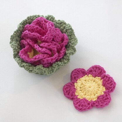 Pretty flower coasters with a little basket crocheted in pure cotton. I use Lily Sugar and Cream but any sturdy worsted weight cotton can be used. You can fold them into little flowers and arrange in the basket to create a basket of flowers or just stack them inside for a different floral effect. The little basket has a frilly edge to add to the flower basket look.