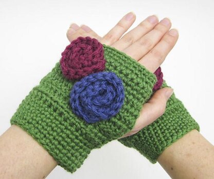The mitts are worked in the round using simple single crochet stitches (UK double crochet), half double crochet (UK half treble) and double crochet (UK treble) stitches. Separate instructions are given for the optional flowers, which add a simple decoration.