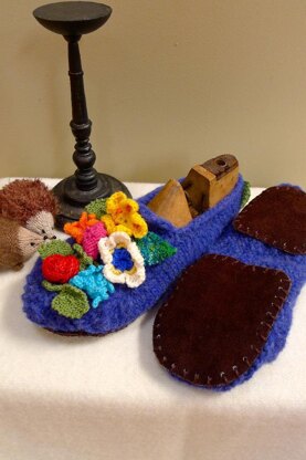 These slippers will not only keep your feet toasty warm in Winter but they will cheer you up every time you catch a glimpse of your feet. A glorious collection of crocheted and knitted flowers and leaves embellish the top of the slippers and are a great way of using up odds and ends of 4 ply. I have sewn leather soles to the bottom of the slippers to give them greater durability and make them non-slip but I would not be traipsing outdoors in them. I think they are strictly indoor for pottering to the kettle to make a cup of tea and then retiring back to the couch with a good book or your knitting.
