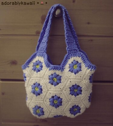 Hexagons are about 3" (7.6cm) across between the points and each straight side is about 1.5" (3.8cm). The bag is 10" (25cm) wide and 9" (22.8cm) tall, excluding the straps. Results will vary depending on your tension and your yarn & hook choice.
