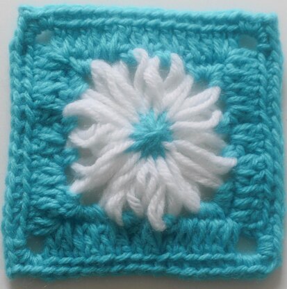 A simple crochet edging “squares up” a 12-petal flower made with a flower loom. The pattern includes a video tutorial for the crochet part of the pattern and a link to another video tutorial for making a yarn flower with the Boye Flower Loom.