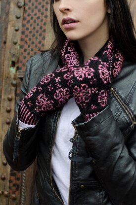 The cowl and mittens set can be knit with a single skein of each of the colors. The sample is knit in Black and English Rose.