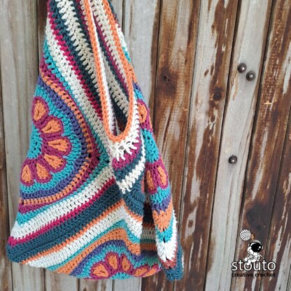 Large Crochet Bag Pattern comprises bold crochet flowers, joined together into a large oversized beach tote bag pattern, extra large handbag can be lined for daily use for shopping or to help carry your office essentials on you commute to and from work