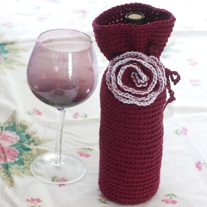 American crochet terms. A festive wine cozy embellished with a pretty flower.. Giving a great bottle of wine to someone - make a sparkly tote to "wrap" your gift. A great hostess gift. And easy pattern that works up quickly. The bag is approximately 3 inches wide and 11 inches long but can be made to almost any size.