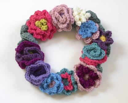 A great stash buster, the pattern includes instructions for 10 different flowers which can be made from all your little bits of left over yarn. Also instructions for putting the wreath together.