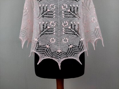 Pattern of shawl is charted and easy to follow. Shawl gets its shape by decreasing method – you start with bunch of a stitches (edge lace) and decrease stitches as instructed.