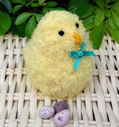 Chick is quickly knitted in a single piece, using two straight needles and small amounts of Chunky fluffy yarn.