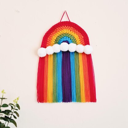 This rainbow pattern creates a large sized rainbow with the fluffiest of clouds created by easily making and attaching some pom poms!
