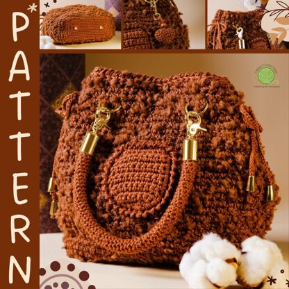 Crafted in the round using cotton for the base and straps, and a soft cotton-wool blend for the body, this hobo bag pattern features contrasting textures that make it truly one-of-a-kind. Its compact size is perfect for special events, parties, or casual outings, while the chic drawstring cords add both flair and function, keeping your belongings secure.