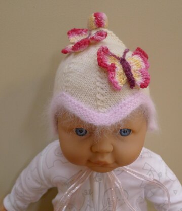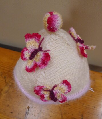 This is a newborn size pixie hat with a border of the softest Angora yarn. You only need a very small amount. I knitted four little butterflies in a little bit of left over sock yarn and made a knitted pom-pom in the same yarn. By starting the butterflies in same colour in the variegated yarn each time your butterflies will come out looking remarkably similar. Pale pink ribbons finish off the hat. If you are concerned about wool being an allergy issue you can leave off the angora and knot the hat in cotton or even an organic cotton. Cotton does tend to come out a little bigger and does stretch. You may need to adjust your needles and always wash cotton in hot water to return it to its original size. cold water will see it stretch even more.
