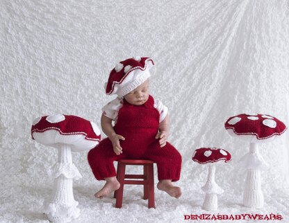 3 Fly Agarics and baby beret. The toys are knitted in the round and that is why the pattern is recommended for Advanced Beginner Knitters.