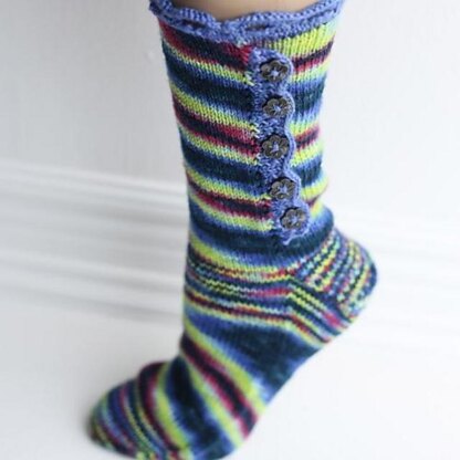 These pretty socks are knit from the cuff down with a flap and turn heel. Extra stitches are added as the leg is worked and set aside for the button loops, which are worked last.