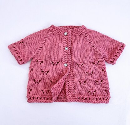 This summer baby cardigan knitting pattern features a lace butterfly motif adorning the body, with additional butterfly on each short sleeve. It is a seamlessly knitted from the top down using raglan method, worked flat (back and forth) for the body and in the round for the sleeves.