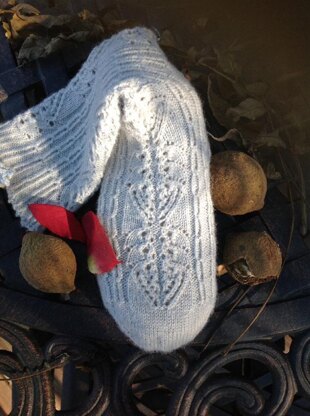 Flying Hearts Socks are knit toe up featuring lace work and donut cables, Judy's Magic Cast On toe, and options for plain or reinforced heel. Lace and cables make the sock fabric stretchy. Directions are for adult woman's socks size small and medium, equivalent to a fit for shoe sizes US 6-7 (EU 36-37) and US 7.5-8 (EU 38-39). Lace pattern is in chart format only. This pattern assumes knitting experience and ability to read knitting charts.