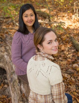 Leaf motifs flanked by a chevron of eyelets decorate the yoke of this cardigan and shrug knit from the top down.
