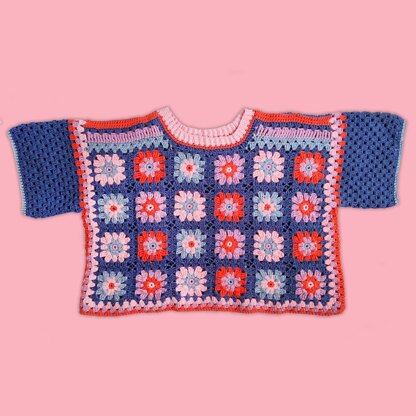 This top shows how you can use the motif designed for the collar in a different way. The Flower motif can also be exchanged with a 4 round Granny Square or the Join-The-Dots spot square to use the pattern to create a really different look!