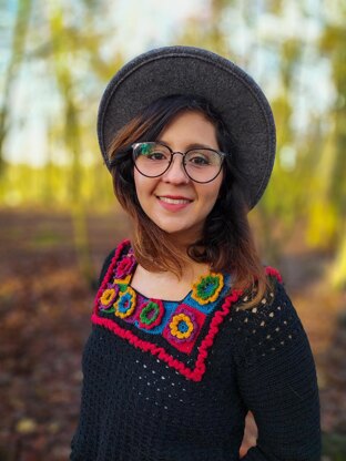 Color, fun and self-expression are the foundation of this striking, yet super wearable jumper. With simple granny squares around the neckline and an interesting stitch pattern throughout the body, it will keep you entertained from beginning to end. The pullover can be made cropped or as long as desired. #FolkJumper