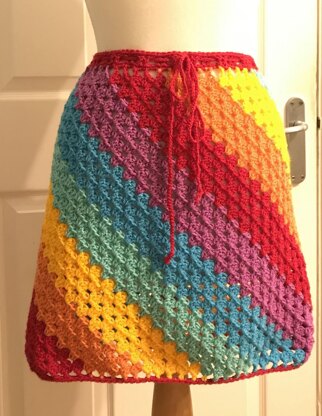 The skirt is worked back and forth in diagonal rows and then joined along a side seam using sc. This pattern is great for using up yarn scraps.