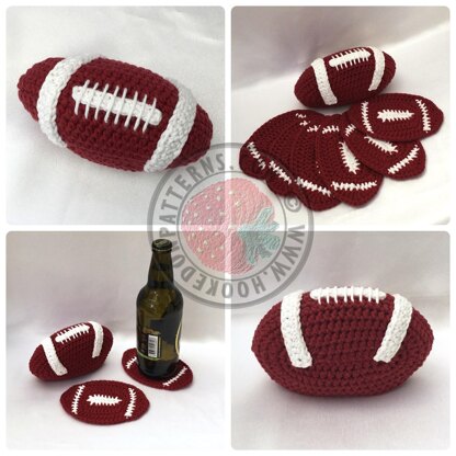 Crochet this fun American football coaster set, 6 shaped coasters in a neat football shaped holder.