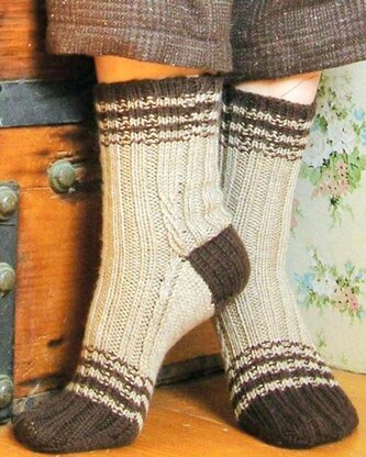 These boot socks knit up quickly in sport weight yarn for warmth. The cables begin halfway down the cuff and pull the fabric in to add shaping. The stripes at the top and before the toe are worked in the same contrasting color as the heel and toe. This allows even the large size to be knit from just two skeins of Stroll Sport.