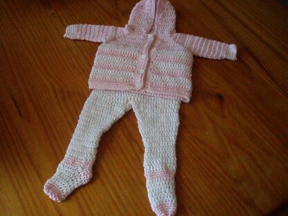A pattern for a baby girls hooded jacket and matching footed leggings.