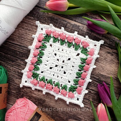 The "For the Love of Tulips" Coaster is not your ordinary granny square coaster. The crisp cotton fiber worked with an undersized hook creates loads of stitch definition and a thick, durable fabric. The lacey stitches breathe a vintage vibe throughout the design, while the rows of plump tulip flowers peeking out truly transform this motif into a modern crochet décor piece. One coaster takes roughly 2 hours to create, but before you finish your first one, you’ll already be planning your color combos for the next ones.