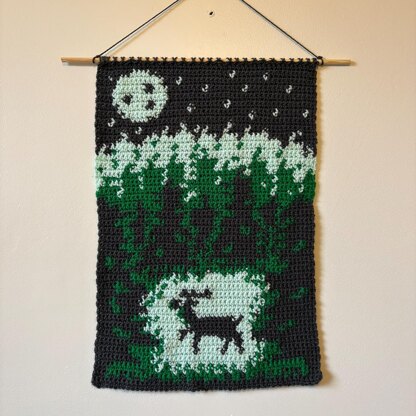 This listing is for a PDF download of a pattern to create a tapestry crochet scene of a forest at night 🌲 🦌 🌔