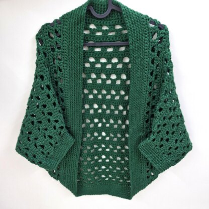The shrug is constructed from a single rectangle with no shaping, and only minimal seaming is needed to create the armholes—making it a perfect project for beginners and a fast project for advanced crocheters.