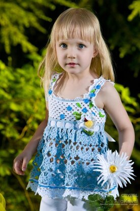 Delicate forget me nots cascade down into a cool lacy pond. Beautiful ruffles resembling the petals of flowers trail around the bodice. This Top Tunic screams gorgeous! Perfectly pretty in baby blue and white, this top features adjustable straps and waist ribbon tie and topped with a bunch of cute crocheted forget-me-not flowers at the bodice, which are crocheted separately and securely sewn on. This top can be made in any color combination from any sport weight yarn. Just imagine your daughter wearing it! She’ll feel like she’s danced in a flower garden during the Alaskan Summer.