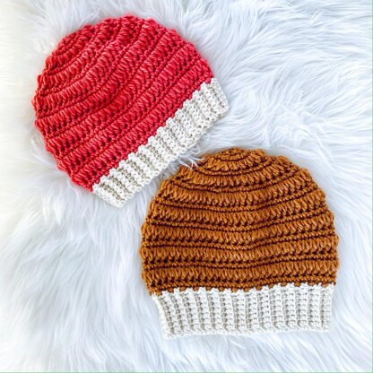 The hat ribbing is added using the “join-as-you-go” technique which means minimal seaming! For the body of the hat, you use the larger hook size; for the ribbing, you will go down to the smaller hook for a nice, snug fit.