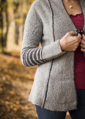 Knit from the top down, “Fortitude” has a classic shape with fun stripe details on the sleeves. Its design combines two different knitting methods: traditional saddle shoulders and contiguous sleeves after the method developed by SusieM. It is also absolutely seamless! Even the hidden pockets are attached as you work the short-row-shaping for the lapel!The fronts are held together by two buttons with a thread shank for an extra stylish look.