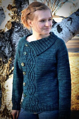 Options are included for a right side opening sweater (option 1) as the sample pictured, or left opening (option 2). Pattern also includes instructions for a shaped or non-shaped waist. Sample size is 36 worn with about 2 inches of positive ease.