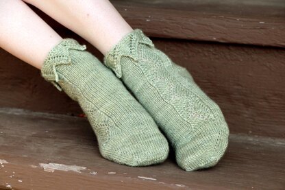 With the kelp-like lace inset and shark-tooth edging, these socks show off their beach inspiration in style. They are knit from the toe up with a shaped toe and gusseted short row heel, which lets you try them on as often as you like. The summer fun continues with a short (ankle-length) leg and the folded over edging. These are the socks I’d wear with super-cute shoes after a morning of beachcombing!