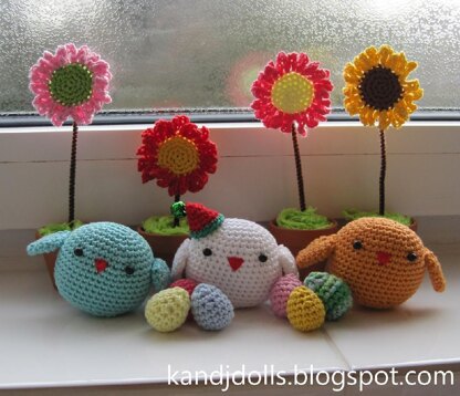 A pattern for all four seasons. The Green Bird is for the spring. She comes with a pattern for little easter eggs. The Blue Bird is for the Summer and has a pattern for colorful flowers. The Orange Bird stands for Autumn and has a delicious candy corn pattern. The White Bird is for the winter. She comes with a cute Santa Hat and Christmas Tree.