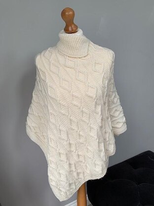 This poncho is knitted in two sides with a diamond cable detail and slipped stitch lines with ribbing at the neck.