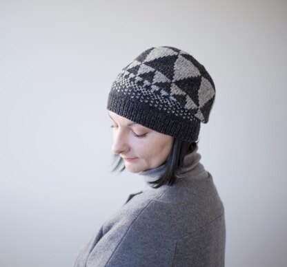 Colorwork on this hat is inspired by fractals geometry occurring in nature. It is created combining neutral and neon colorways together into triangles starting at the brim. Then they progressively increase in size, forming the allover pattern. The colorwork is also integrated into crown-shaping and makes this hat an eye-catching accessory from all angles. Accompanied with Tubular cast on and ribbed brim this hat conveniently comes in 2 sizes.