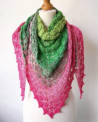 A relaxing 2-row crochet shawl with an easy shell pattern. One skein of your favourite fingering weight gradient yarn, is all that is needed to make this light and lacy triangle shawl, and only 2 ends to weave in. An easy make using basic stitches so you can relax and crochet!
