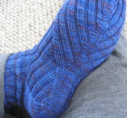 These socks were designed with an adventurous knitter in mind. While the leg of the socks is easier to execute than it might appear at first glance, the foot of the socks involves shaping that is probably new to most sock knitters. This shaping results in interesting curves in new places, a foot-hugging contour that surpasses the comfortable clinging power of most traditional ribbed socks, and a new way to shape a toe. The socks may take a bit more