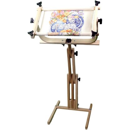 Perfect for needlepoint cross stitch, crewel, embroidery and beading! This adjustable floor standing scroll frame is a combination of the 12x24 inch split rail scroll frame with the universal craft stand. This hands-free needlework frame fits every stitchers needs. This frame allows complete access to your work by tilting up, down and rotating a full 360 degrees. With easy turn knobs, it adjusts from 16 to 36 inches tall in order to locate the most comfortable working position. By just loosening two knobs it fold down to 16 inches for storage. This package contains one 9x24 inch Stitcher's Wonder! Floor Stand Scroll Frame. Made in USA.
