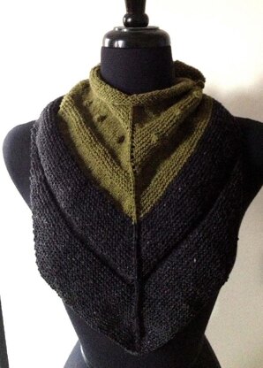 This interesting shawl has a narrow deep-v shape and opposing segments on either side of the shawl's spine. It also has a row of bobbles which represent the bolts on either side of Frankenstein's neck. ;)