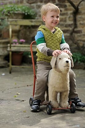 Worked from the bottom up seamlessly until the body is divided for front and back at the armhole level. The body of the vest is knitted in a cabled stitch pattern set on the Stocking stitch ground that lends the fabric its subtle texture. The hood is added to the body after the shoulders had been joined together and is worked in Stocking stitch.
