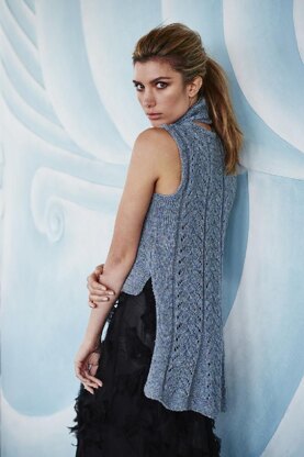 A stunning skirt with a train by Judith Bech, deserves a top with a train. Freja, named after the goddess of love with the added meaning of like a lady, is knitted with a longer back shaped at the bottom. Three Lace panels adorn the sleeveless top with garter stitch bands and vents in the side. A fine tweed yarn is held together with an alpaca lace yarn, with a chain construction, to create a fabric with beautiful stitch definition and a slight halo.