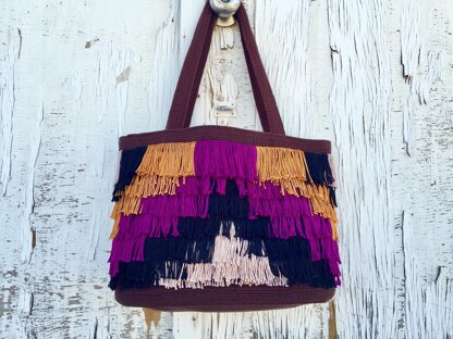This funky fringed tote is sure to make a statement! Swishy fringe detail begs to be touched. The body of the tote is worked in a continuous spiral from an oval base. The sides of the tote have alternating “ridge rows” and plain rows. Ridge rows are created by working into the back loop only of each stitch. Fringe is attached to the front loops of the ridge rows.
