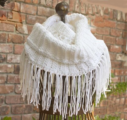 Can you have too much fringe? This cowl is fringed all along on side, not like a scarf with fringe only on the ends. A fun cowl to keep you warm all winter. The cowl is crocheted in the round. It is an easy, flexible pattern that can be made in a variety of yarns and sizes. Its easy to change the size to make a little neck warmer or a big thick scarf. Adaptable to almost any weight yarn.