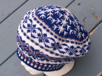 This blue and white adult sized tam is knitted with the stranded or fair-isle technique, never more than two colors per row. The pattern describes how the wheel on the top can be knit with 96 size 6/0 Czech glass beads knitted into it to lend a chill to the Frost Crystal design. Less than an ounce each of blue, white, gray and red fingering weight wool are required. Kits are available through our website.