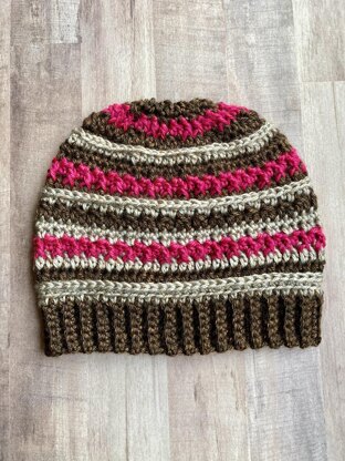 This textured beanie was originally inspired by a cupcake, but it can be anything you want, depending on the color selections. Reimagine it as a Christmas tree, Easter egg, or pumpkin! The pattern starts with a ribbed brim to ensure a cozy fit and is then worked upwards to the top, changing colors as desired. Add a layer of "frosting" if you'd like, and top with a colorful pompom! This versatile design makes a fantastic scrap-buster and is perfect for gifting or stockpiling hats for holiday sales.