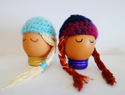These cute egg hats inspired from the movie Frozen are quick and easy to crochet, made with leftover yarn. There are 2 patterns one for Anna's hat – fuchsia and purple and Elsa’s hat - turquoise with a sparkling white snowflake. Skill Level: Beginner