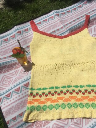 This summer top is decorated with all the ingredients you might add to your traditional spiced gin based fruit cocktail. No brands mentioned. It is worked from the bottom up, in the round, featuring fully charted stranded colourwork. It steadily decreases towards the waist, with eyelet detail to represent the fizz, and gently increases again for the bust. For now, I have only been able to write this in my size, one day when I have more time and experience I hope to come back and recalculate for other sizes. I have made sure all the charts work on a repeat of 20 stitches, so you can increase or decrease the cast on number by multiples of 20 and the charts will stay correct. You will have to do a bit of maths to work out your stitch count to meet your waist and bust measurements if they differ from mine. Measurements - One size, L/XL, 50” at hem , 36” at waist, 42” at bust