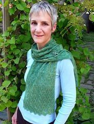 Distinct lines of decreases and openwork create the look of a grapevine trellis across the surface of this airy, lightweight scarf. The stitch pattern is simple to learn and work, with WS rows all in purl; this piece makes a great traveling project. Substituting yarn and/or needles may result in an overall variation in size.