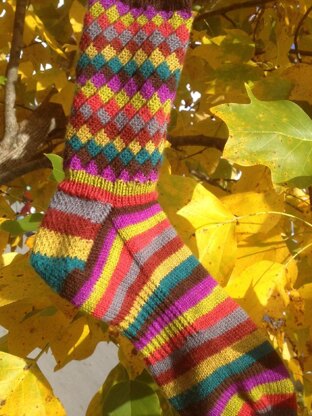The pattern on this cuff reminds me of Fruit Stripe Gum! This fun pattern is an easy one-row repeat that makes your self-striping yarn appear as a diamond shaped pattern. Fun color play! Easy pattern repeat, fitted sole, staggered diamond heel flap and rounded toe.